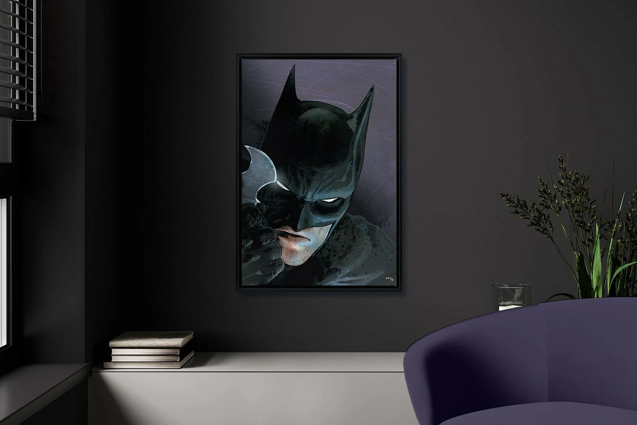 The Batman: Rebirth Canvas Art Print explores the Dark Knight’s duality in an intense portrait. A living extension of the darkness, Batman emerges from the shadows wearing a deep black cowl, cape, and gloves. He wields a shining silver Batarang — a symbol of hope to many, but a symbol of fear to every evildoer in Gotham City.