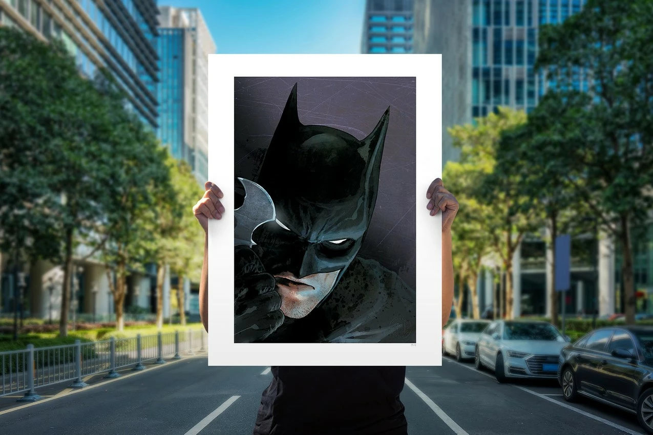 The Batman: Rebirth Fine Art Print explores the Dark Knight’s duality in an intense portrait. A living extension of the darkness, Batman emerges from the shadows wearing a deep black cowl, cape, and gloves. He wields a shining silver Batarang — a symbol of hope to many, but a symbol of fear to every evildoer in Gotham City.