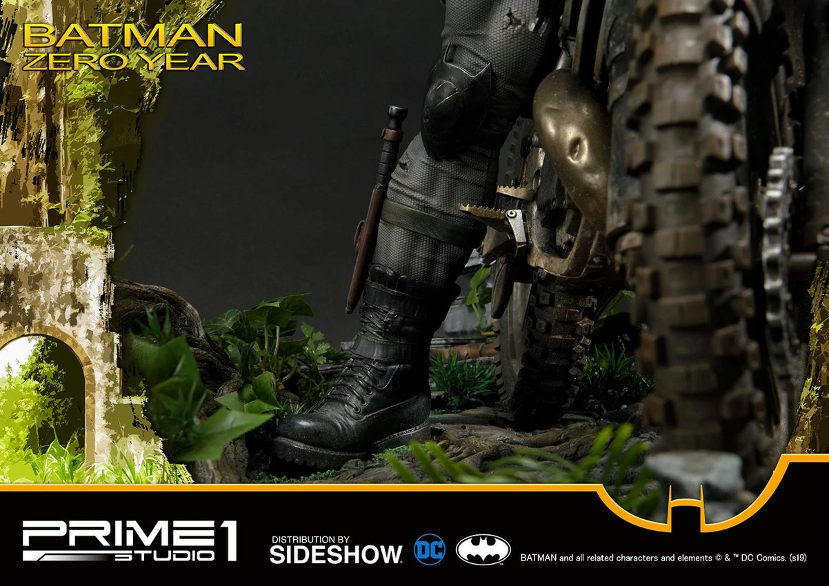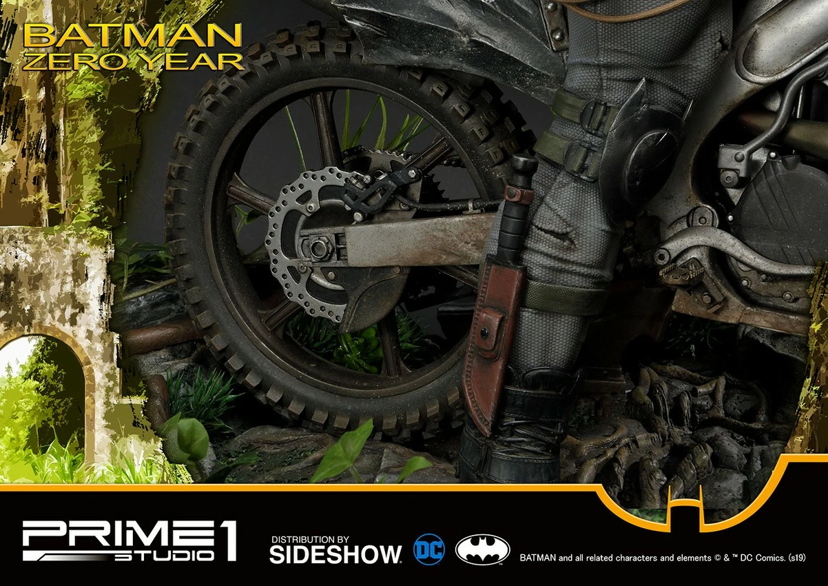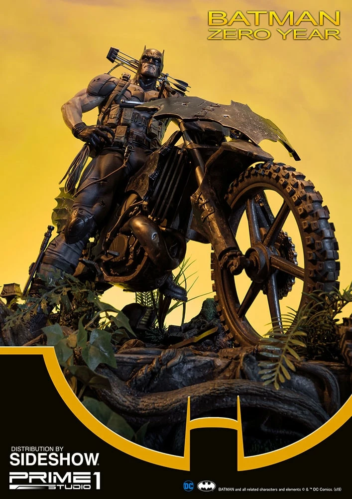 This Ultimate Museum Masterline Batman Zero Year statue shows him riding on his bike and comes with an extra interchangeable right-arm holding the Crossbow. This Exclusive version of Batman Zero Year includes an additional right-hand holding a Grapple Hook.