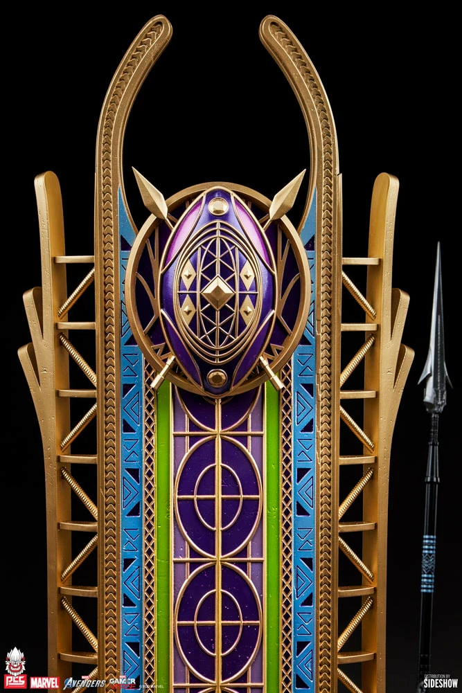 The Black Panther 1:3 Scale Statue measures 37.5” tall and 22.5” wide, inspired by the action-packed addition of Wakanda to the Marvel video game. The stoic King T’Challa displays his might with a Vibranium spear planted firmly beside him, sitting in his throne room. His ornate golden seat is detailed with beautiful Wakandan aesthetics, blending Afrofuturistic design with traditional colors and patterns. A shield emblem and panther sigil adorn the back and front of the throne, giving Black Panther the blessings of the goddess Bast.