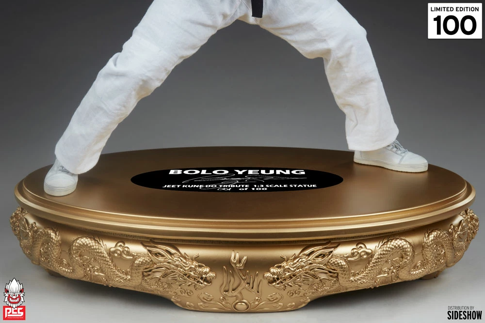 Inspired by an iconic era of his prolific career, the Bolo Yeung: Jeet Kune Do Tribute 1:3 Statue is a mixed media collectible with a fully sculpted athletic physique costumed with white fabric gi pants and a black fabric belt to signify his martial arts accomplishments. As a practitioner of Jeet Kune Do, a martial arts philosophy founded by Bruce Lee, he strikes a wide stance, light on his feet as he flexes his muscles. Bolo Yeung’s portrait features a stern expression and a short style haircut sculpted to frame his face. He stands on a gold-colored base with sculpted dragon details, making this collectible statue a perfect centerpiece for any fan’s action movie display.