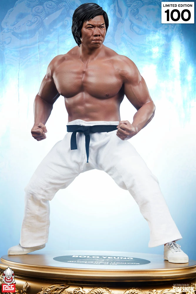 The Bolo Yeung: Jeet Kune Do Tribute 1:3 Scale Statue measures 23” tall and 19.5” wide as an expertly sculpted homage to the renowned Chinese actor, bodybuilder, and martial artist famed for his antagonistic action movie roles. This ultra-realistic and highly detailed statue showcases the athleticism, intensity, and immense discipline exhibited by Yeung in early film appearances that made him a fan-favorite on-screen fighter.