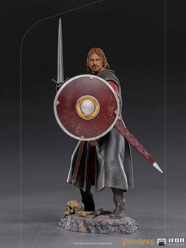 Faithful to the smallest details of the costume, characteristics, and physiognomy of actor Sean Bean, Iron Studios presents its statue of the warrior prince Boromir – BDS – Lord of the Rings – Art Scale 1:10 – Iron Studios, where the brave hero holds his circular shield firmly against his chest, while he wields his broad sword with his right hand, firm and focused for combat, carrying the Horn of Gondor, the symbol of his people and heritage of a line of Kings. This Lord of the Rings statue comes with a base representing the petrified ground of Minas Moria, with the remains of bones and weapons of Dwarf warriors, who are lying at his feet.