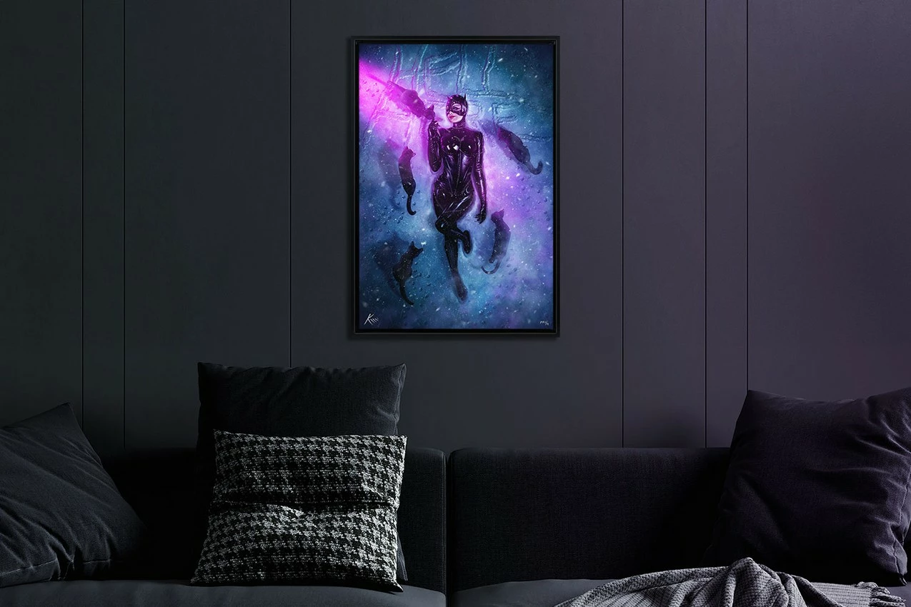 Inspired by Tim Burton’s Batman Returns (1992), this Catwoman art comes professionally finished with a certified archival varnish and a black wood floating frame. Each Catwoman: HellO THere Canvas Art Print also features an authorized, automated artist signature as part of the limited edition of only 50 pieces.
