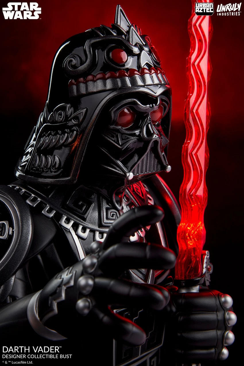 Search your feelings — you know this to be cool! Urban Aztec goes galactic in the Darth Vader Designer Vinyl Collectible Bust by artist Jesse Hernandez, blending imperial aesthetics to unleash a Force like never before. With a light-up feature in the red saber blade, you can balance out the darkness in his heart wherever Vader is displayed.