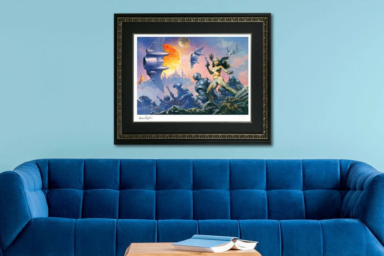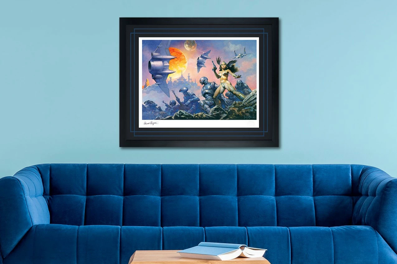 Each Dawn Attack Fine Art Print in the limited edition of 300 pieces includes a Certificate of Authenticity and features a hand-stamped, authorized signature of artist Frank Frazetta as well as the official Frazetta Art Museum embossed Seal of Authenticity. A portion of the proceeds from sales of Dawn Attack will benefit the Frazetta Art Museum’s preservation and exhibition of the artist’s essential works. This sci-fi artwork is available as an unframed giclée, in a black framed format, or in a deluxe silver framed format, making this an unforgettable addition to any collection.