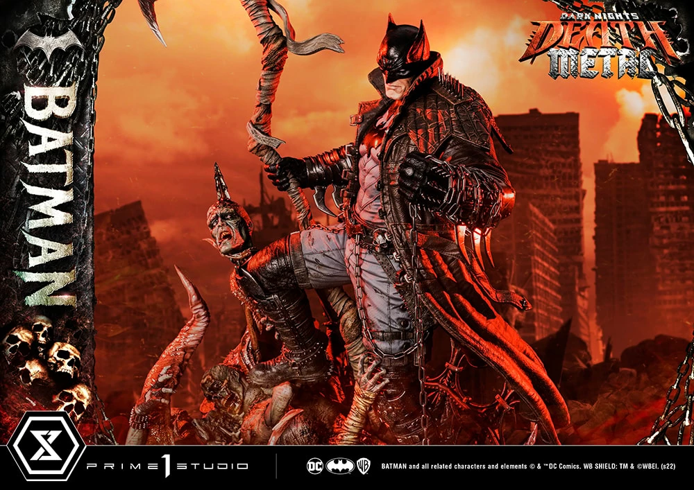 Prime 1 Studio has crafted a Batman at his most dangerous! At a commanding 41 inches tall, he has shed every pretense of subtlety! Batman has covered himself in a grungy, bat-like leather trench coat with over large shoulder spikes, solid metal bracers with razor-sharp fins, and an industrial strength utility belt chained to the toughest-looking, butt-kicking boots! In the books, his trench coat grants Batman the power to cloak himself from detection. The Dark Knight has taken it upon himself to become a post-apocalyptic Grim Reaper by wielding a giant scythe as his signature weapon! Most of all, he has found himself the owner of a powerful Black Lantern ring, allowing him to command an inexhaustible supply of reanimated corpses: his Undead Army!