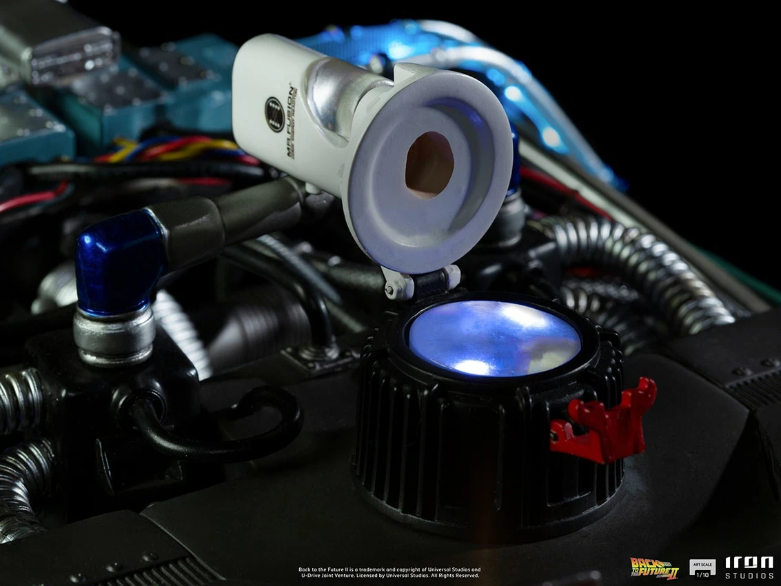 The vehicle was faithfully replicated with all the details of the original one, with cables, wires, and gadgets, full of internal and external lights, and even with the so-called Mr. Fusion, which produces fuel from waste (preferably organic). With a light in its unmistakable flux capacitor, wheels raised in flight position, the vehicle is supported by a side rod, similar to the one used in the movie scene. Last but not least, the open seagull door, which reveals the interior of the Delorean and the circuit of time. The material used for the production of the vehicle was, for the most part, resin, with a minimum of plastic parts used in its composition. Sideshow and Iron Studios proudly present its first statue version of the fantastic “DeLorean Set Regular Version 1:10 Art Scale Statue,” which provides the backdrop for this diorama.