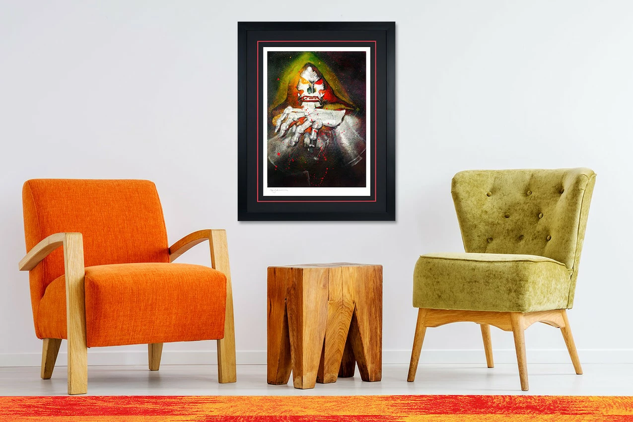 More than just a mask, the mind of Victor Von Doom is unmatched in strength, cunning, and ruthlessness. Legendary comics artist Bill Sienkiewicz gives Doctor Doom the royal portrait treatment in his signature illustration style in Doctor Doom: The Master. Burning red tones highlight the traditionally dark shadows of his metal mask, giving him an eerie, unearthly appearance. His armored hands rest calmly before him as he calculates his next strategy to defeat his foes, rule his kingdom, and bring order to a chaotic world.
