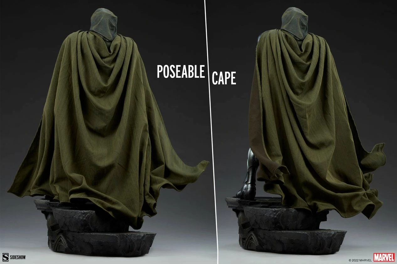 The Doctor Doom Maquette is a mixed media collectible blending sculpted and fabric elements into an incredible presentation befitting one such as Doom. His green fabric cape features wire in the hem for posing, while the hood on his modern masked portrait is sculpted to capture the dramatic shadowing of his unchanging iron visage. Doom’s costume also consists of a sculpted green bodysuit and silver riveted armor with gold accents to give the ruler of Latveria his signature comic book appearance. This is a must-have Marvel statue for fans and loyal peons who recognize the supreme intellect and mystic ability of the unshakeable metallic monarch.