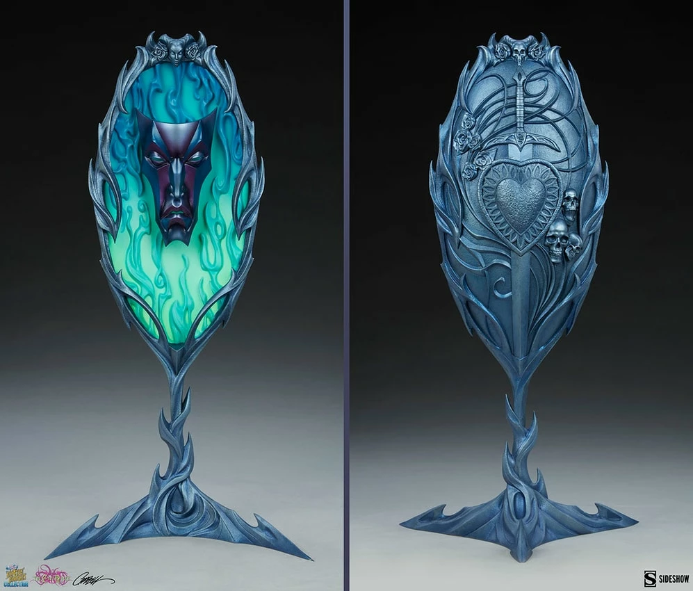 A loyal servant to the Evil Queen, the Magic Mirror proximity figure measures 19″ tall and reflects its master’s lethal obsession with appearances. A grim mask-like visage extends from the center of the looking glass, engulfed in curling blue and green sculpted flames. The silvery-blue mirror stand has an intricate, sharp design with sculpted reliefs on the back that depict a sword, skulls, roses, and a heart, all in reference to the classic tale.