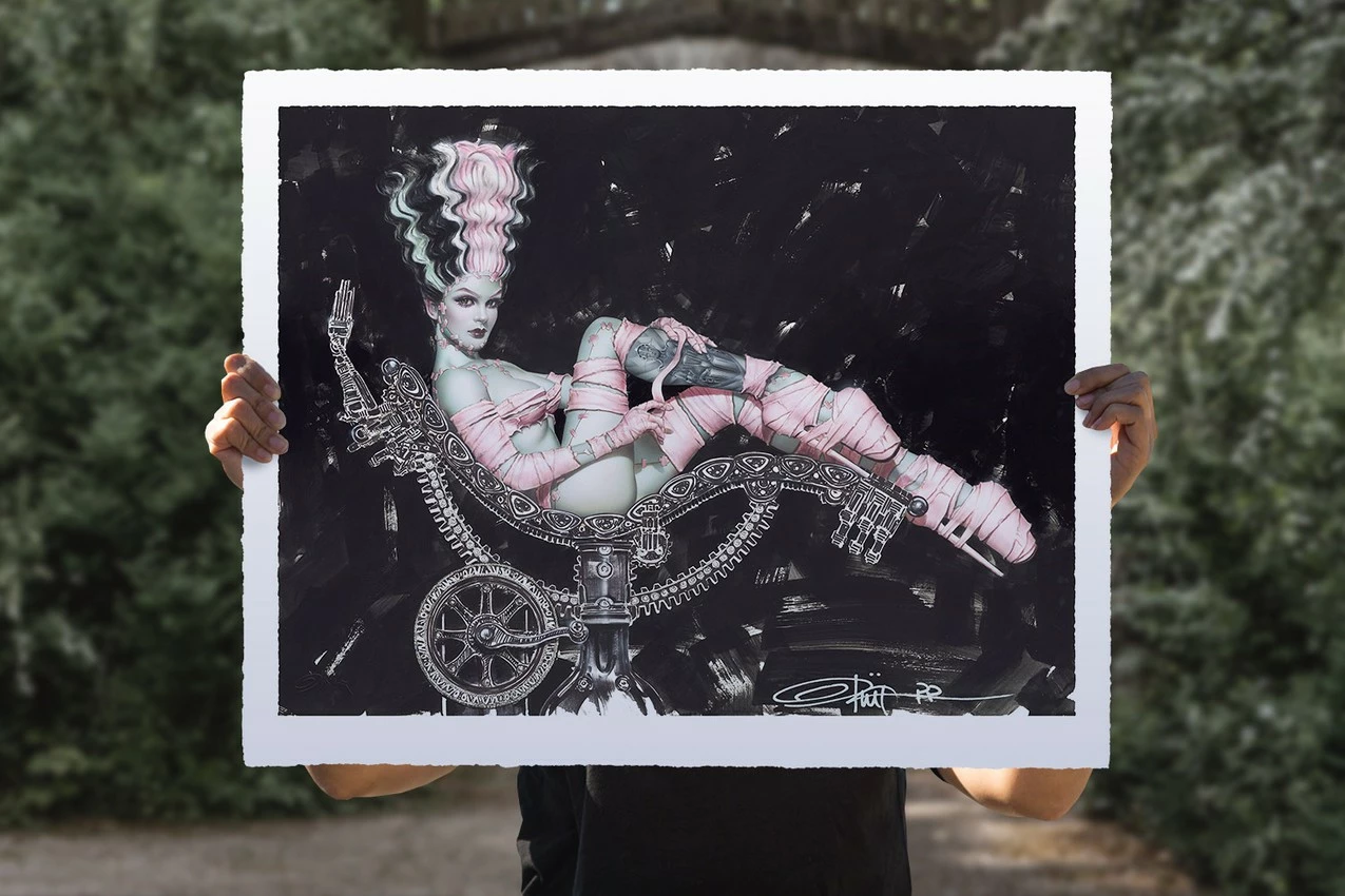 Each Frankie Reborn Fine Art Print is hand-signed by Olivia herself and features her official embossed Seal of Authenticity along with a hand-signed Certificate of Authenticity as a part of the limited edition of 300 pieces. This high-fidelity reproduction of Olivia’s original acrylic on wood painting is available to fans as an unframed giclée with deckled hand-torn edges or in a custom framed presentation. Whether you’re a pinup enthusiast or a horror art collector, you won’t want to miss adding this Frankenstein creation to your collection!