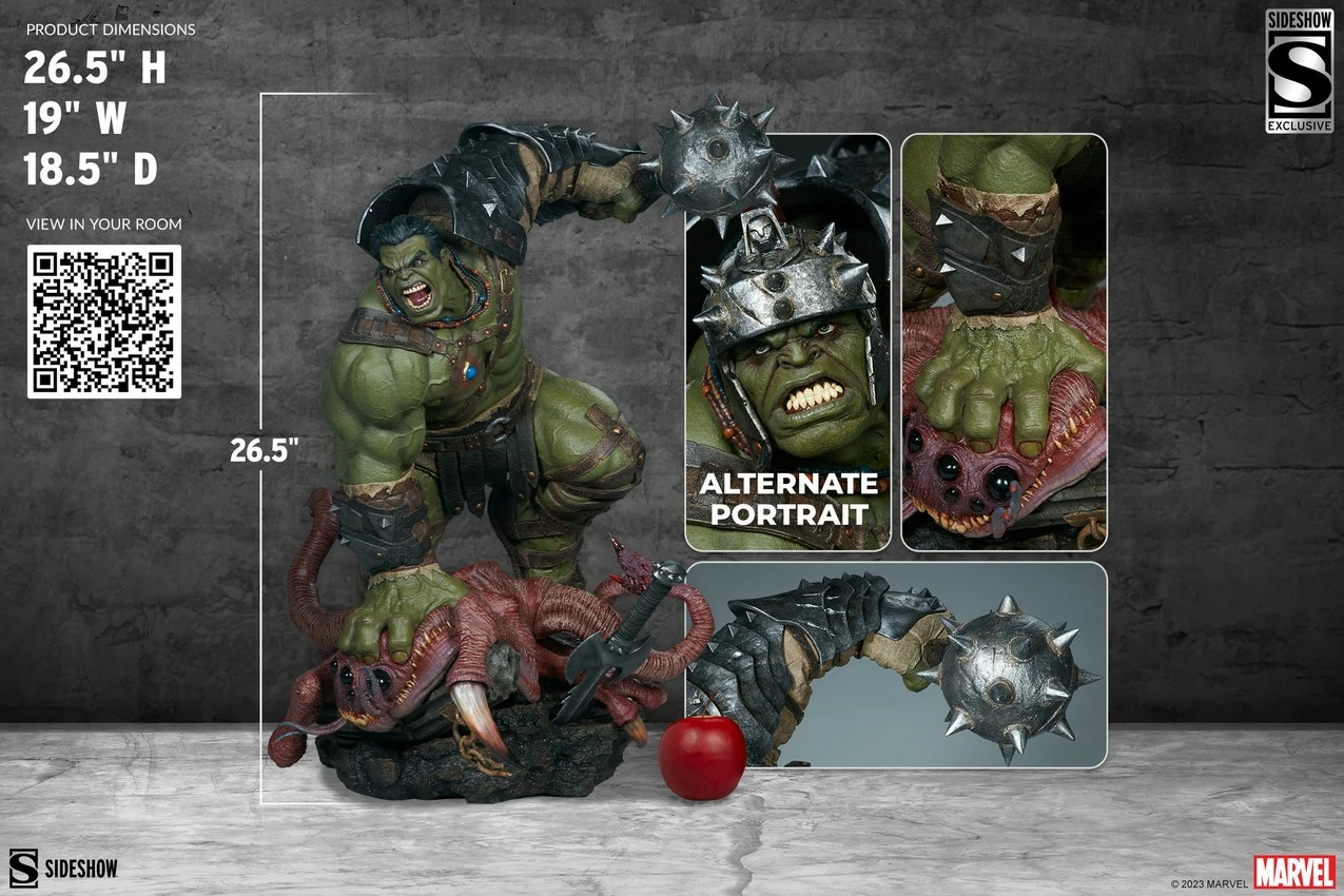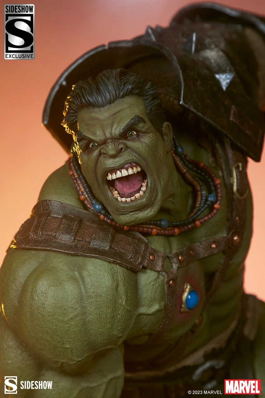 The Exclusive Edition of the Gladiator Hulk Maquette includes an alternate unhelmeted portrait with an enraged expression. Challenge the Red King and smash all the puny pretenders with this exclusive display option.