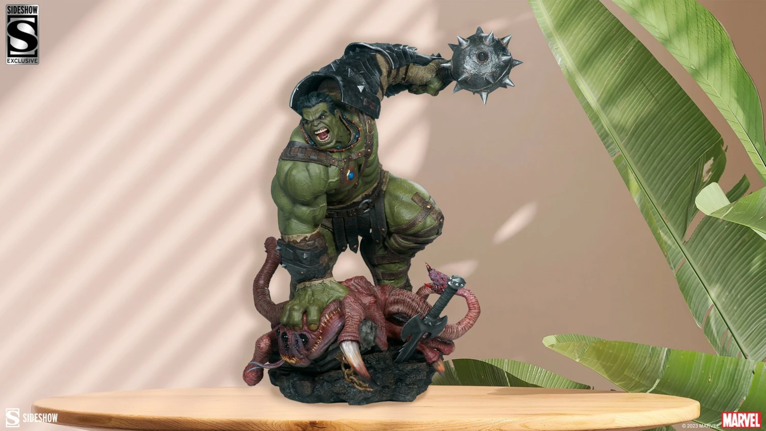 The polyresin Gladiator Hulk Maquette is highly detailed with textured skin, intricately sculpted muscles, and a variety of leather and cloth-like costume details. As the champion fighter of Sakaar, the Hulk is covered from head to toe in sculpted gladiator garb, including distressed shoulder armor and a silver spiked helm. Sculpted leather-like straps and sandals cover his massive green physique, while this champion fighter is decorated in bead necklaces and a blue obedience disk embedded in his chest. He has an epic battle mace clutched in one giant green fist, showing the spectators of Sakaar why he’s earned the name World-Breaker.