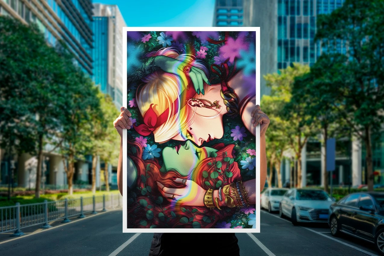 Originally created as a variant cover for DC Pride #1 (2021), an anthology written for DC Comics, this Harley Quinn and Poison Ivy art is now available to fans as an unframed giclée or in a custom framed presentation. Each Harley & Ivy Fine Art Print features an embossed Sideshow Seal of Authenticity as part of the limited edition of only 150 pieces.