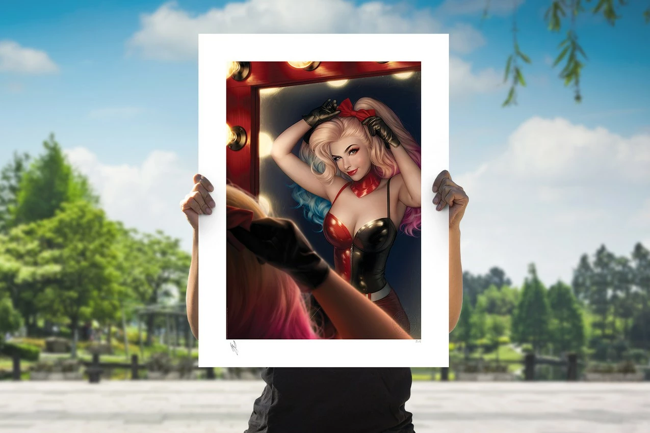 The Harley Quinn #1 Fine Art Print features Harley-frickin’-Quinn herself wearing a black and red corset as she poses in front of a lightbulb-lined dressing room mirror. Her blonde hair, tipped in bubblegum pink and cotton candy blue, cascades down her arms and back as she pulls a red bow into place. Harley further accessorizes with black gloves, a red collar necklace, a white belt, and perfectly painted red lips, proving to the audience lingering over her shoulder that she’s about to be the star of the stage.