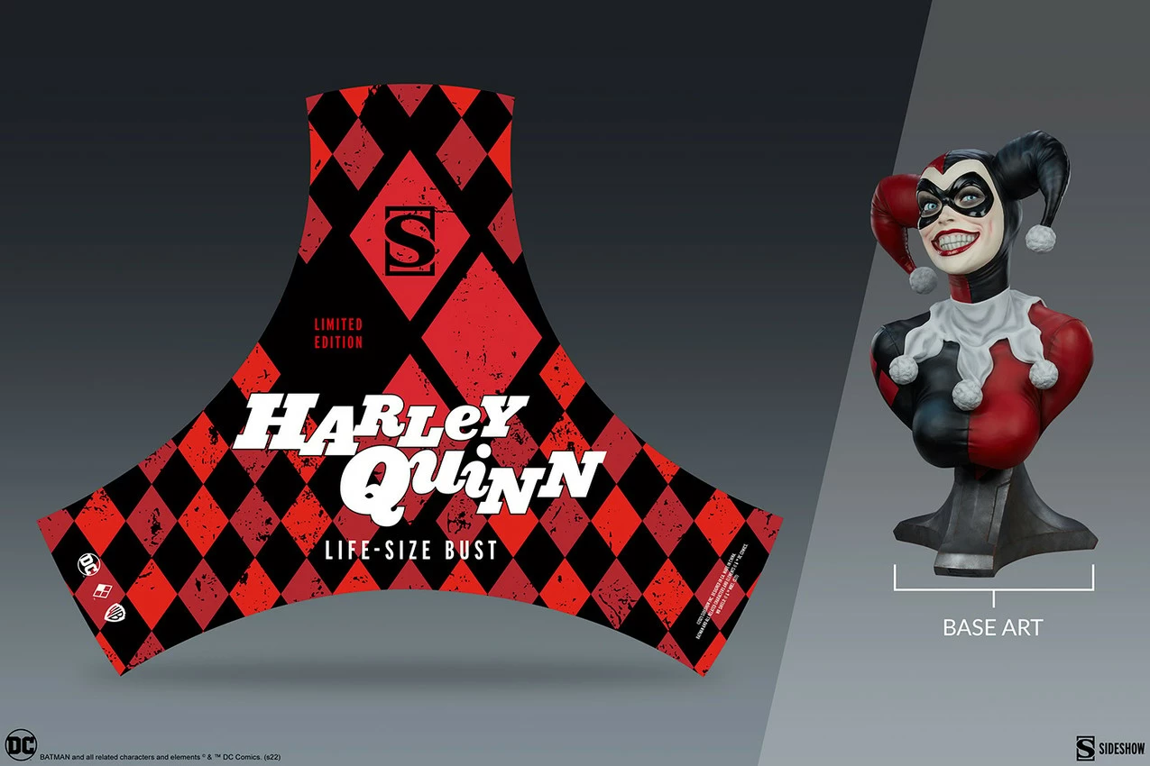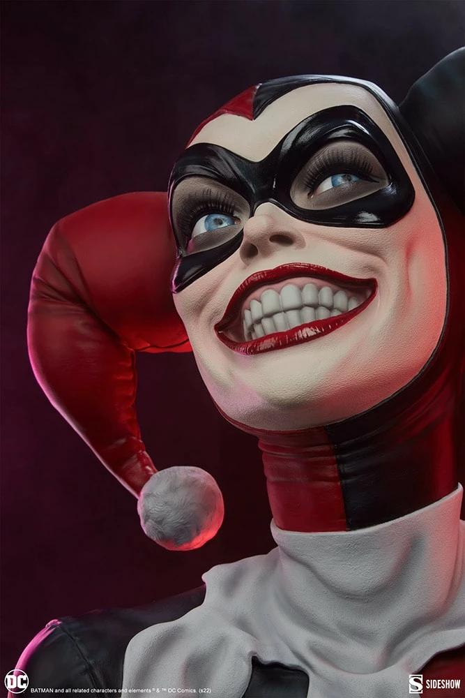 The Harley Quinn Life-Size Bust measures 28.5” tall, putting you face to face-paint with an epic 1:1 scale depiction of the Maid of Mischief herself, your old pal Harley! Inspired by her iconic original DC Comics appearance, this fiberglass bust captures all the bright and bubbly personality of the beloved prankster as she coyly shrugs her shoulders in denial of whatever crazy scheme Batman will blame her for next.