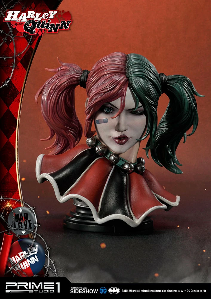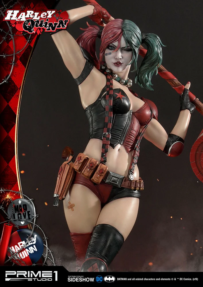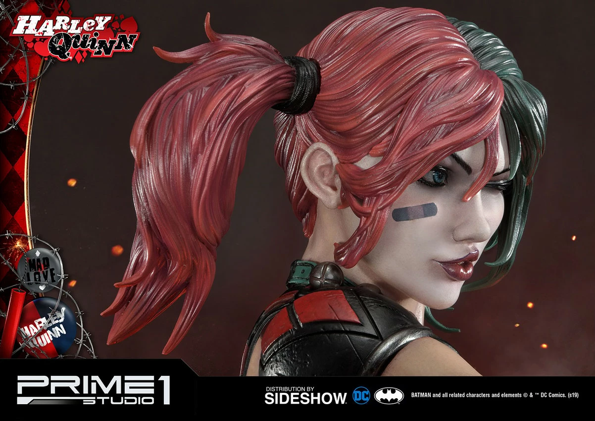 Sideshow and Prime 1 Studio present the bubbly supervillain, Harley Quinn from DC Comics. All the essential details of the character have merged with the Comic taste in this statue representation of Harley Quinn. There are two alternative portraits with a headstand featured in this version. Her iconic blonde hair portrait is included as well as a red and green hair color portrait which matches her costume. Harley Quinn wields her iconic mallet as she looms above her LED illuminated dynamite-themed base.