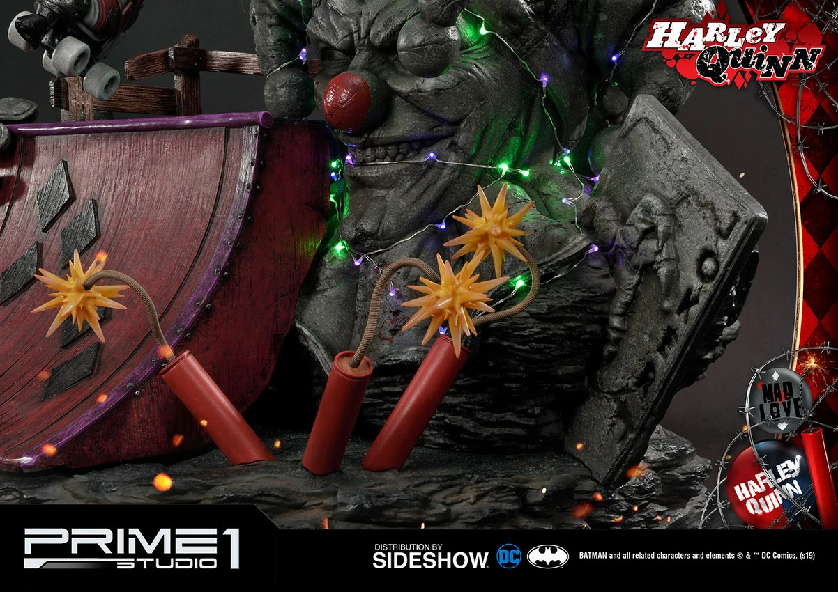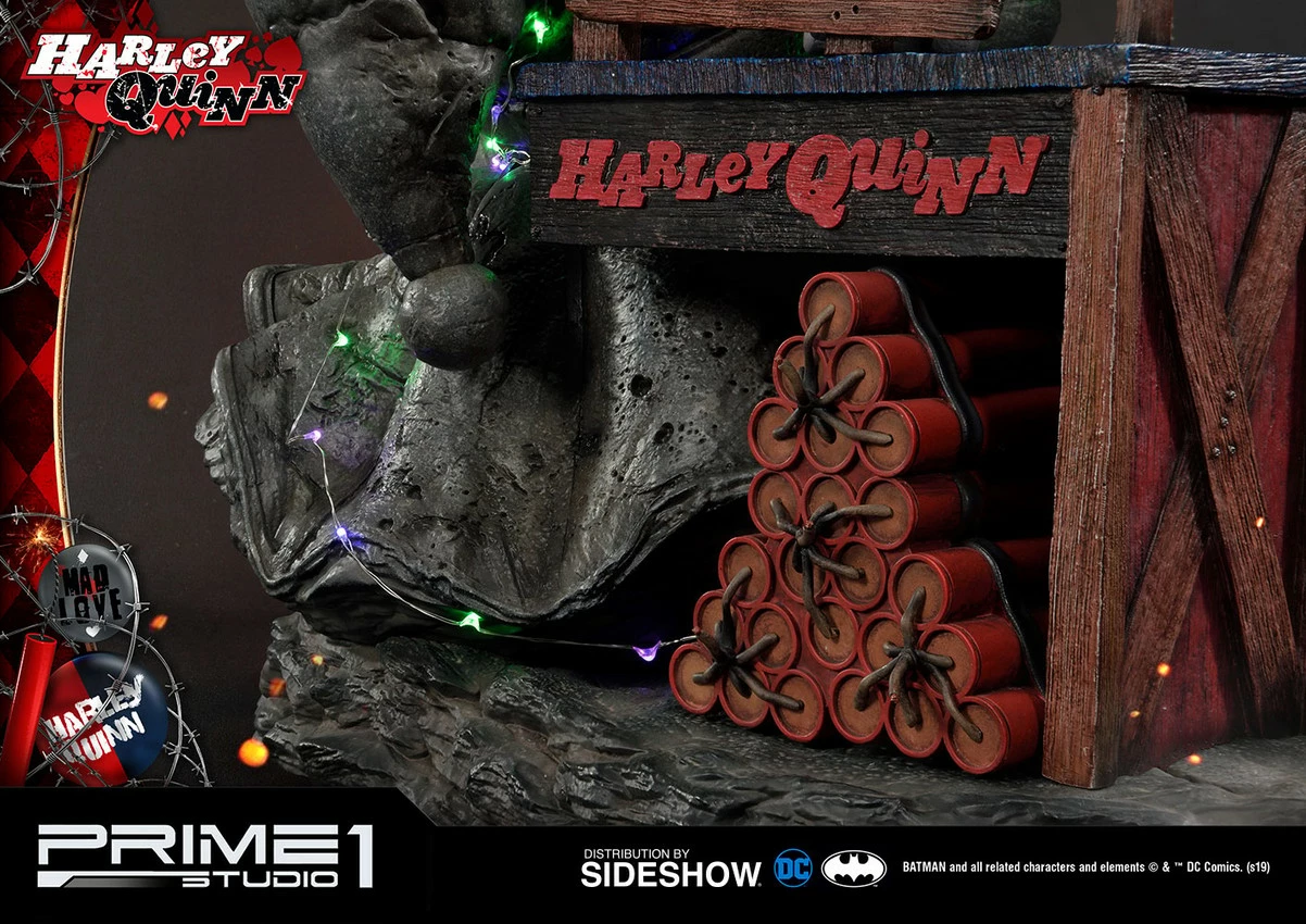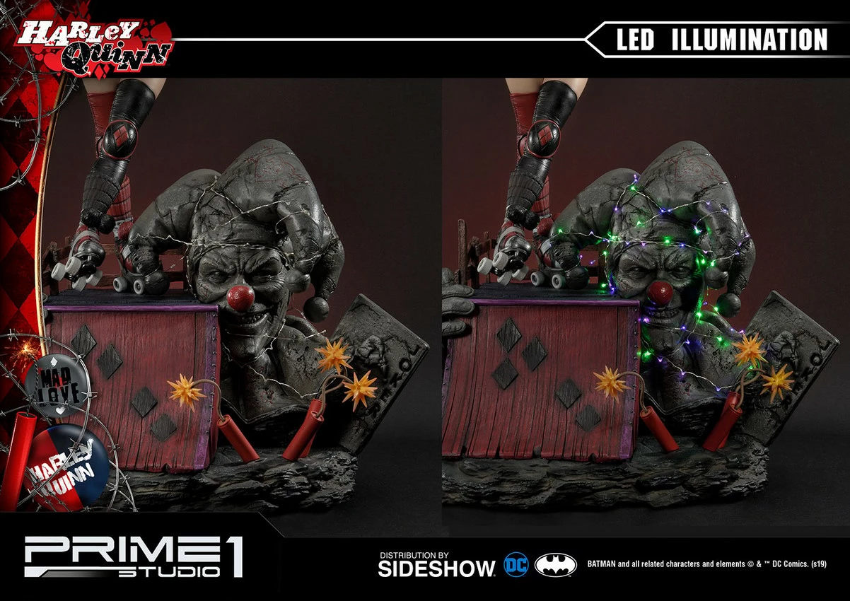 Sideshow and Prime 1 Studio present the bubbly supervillain, Harley Quinn (Deluxe Version) Statue from DC Comics. All the essential details of the character have merged with the Comic taste in this statue representation of Harley Quinn. The Deluxe Version includes multiple parts to support a variety of poses. There are four alternative portraits to choose from with three accompanying headstands featured in the Deluxe Version. Her iconic blonde hair portrait is included as well as a red and green hair color portrait which matches her costume. Harley Quinn wields her iconic mallet as she looms above her LED illuminated dynamite-themed base.