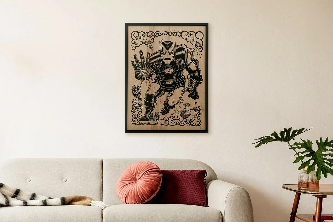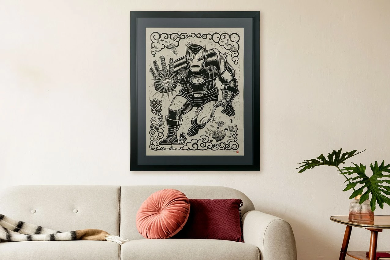 Tinker with your collection like a true futurist and bring home the Iron Man Linocut on Lokta Paper by Peter Santa-Maria today!