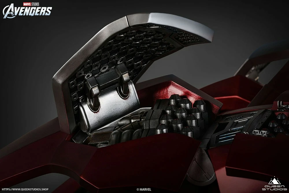 Queen Studios have recreated the Mark 7 armor in a static pose while displaying the wind breakers fully engaged for a dynamic look. The suit boasts race-car red, and gold – along with a stand-out silver panel. This armor’s ridged design is more distinguishable from later models.