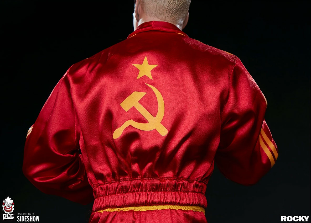 The Ivan Drago 1:3 Scale Statue features tailored red and gold fabric shorts accented with a hammer and sickle design. He also includes a matching jacket that can be displayed on the figure or nearby on the accompanying proximity stand. Finished with sculpted red and gold boots, red and white socks, and red gloves, Ivan Drago is ready for a final fight against Rocky Balboa.