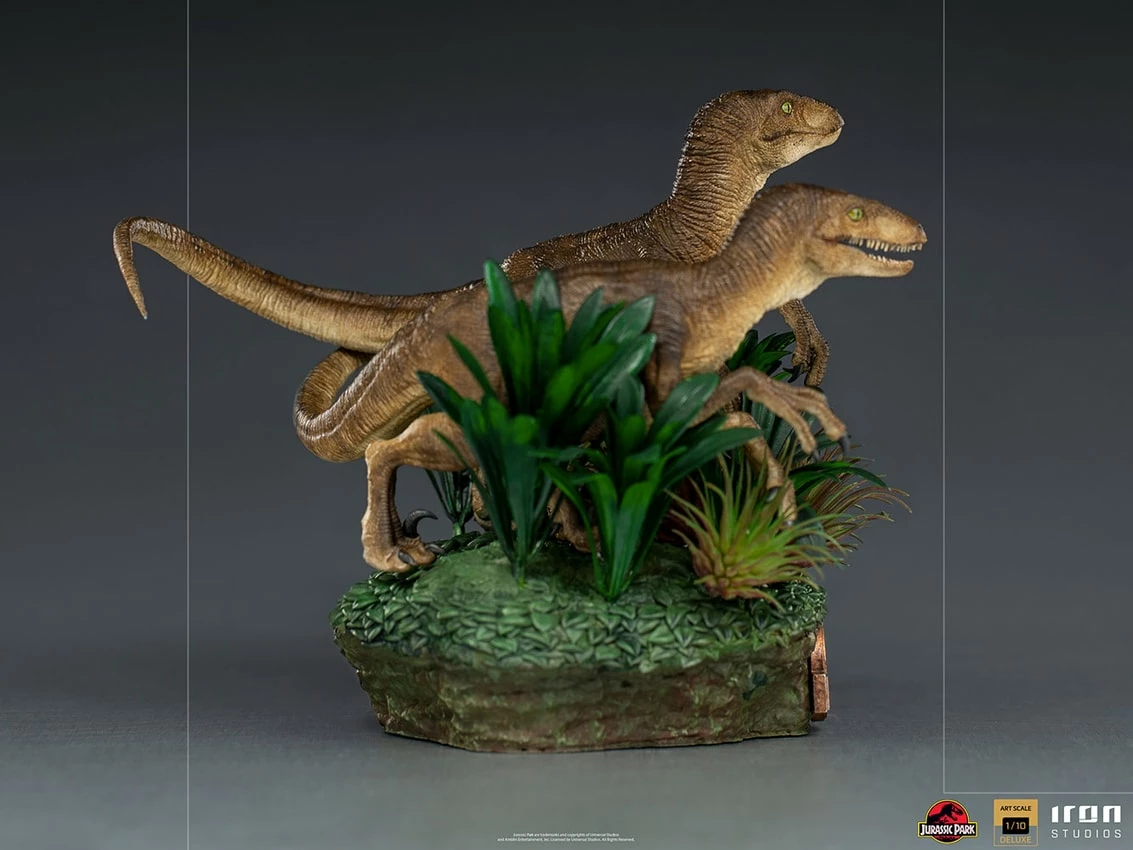 Hidden among bushes, two prehistoric predators sneak forward, watching and sniffing out their next prey. They hunt together using their natural intelligence to reach their goal faster and more effectively. Among the most feared creatures of the Jurassic world recreated by man, Iron Studios presents, Just The Two Raptors Deluxe Art Scale 1:10 Statue. The design of the lethal velociraptors is faithfully represented to honor the legacy of the work of Stan Winston and Steven Spielberg.