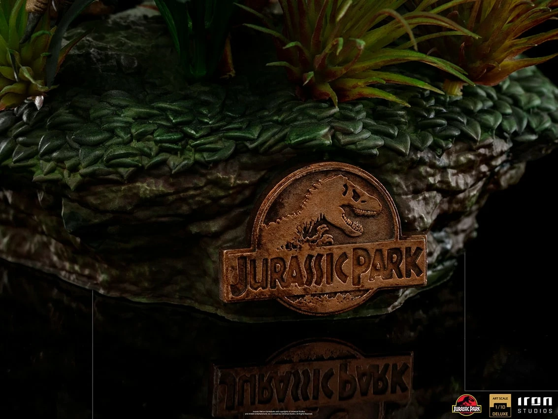 Inspired by a promotional concept created by Stan Winston’s studios, master of visual effects and responsible for the creation of the dinosaurs in the 1993 movie Jurassic Park, Iron Studios recreated this scenario. The scary beasts are presented in their original tones on a diorama base formed by the earthy terrain of the Costa Rican rainforest. The raptors present themselves as if they were moving through the vegetation, with the iconic Jurassic Park logo carved into the front.