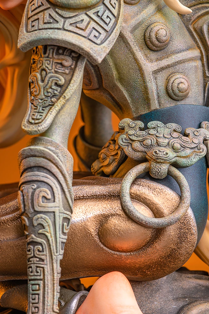Legend tells a story about a Kirin who turned to human form, with his dragon tail remaining. He has pointy ears, walks on bare feet, and his whole body is covered with the armor named Qingyu, which is made out of bronze and shines like jade. Decorated with the divine ancient beasts, the armor protects the Kirin warrior from defeat.