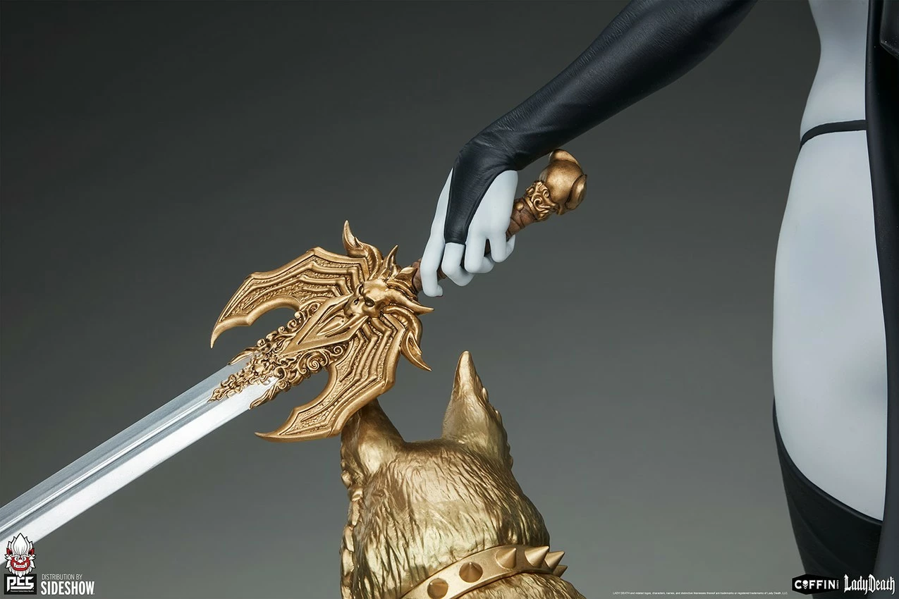 The Lady Death Statue measures 30.5” tall and 28” wide as Hell’s queen descends an ornately detailed gold staircase flanked by a pair of snarling hellhound sculptures. She holds a skull-tipped scythe in one hand and her legendary sword in the other, ready to fight back against the unholy legions of her enemies. The statue includes two unique metal swords — Deathbringer and Chaos — that can be swapped out in her left hand, while the alternate weapon can be cradled by the skull sconces on the back of the base.