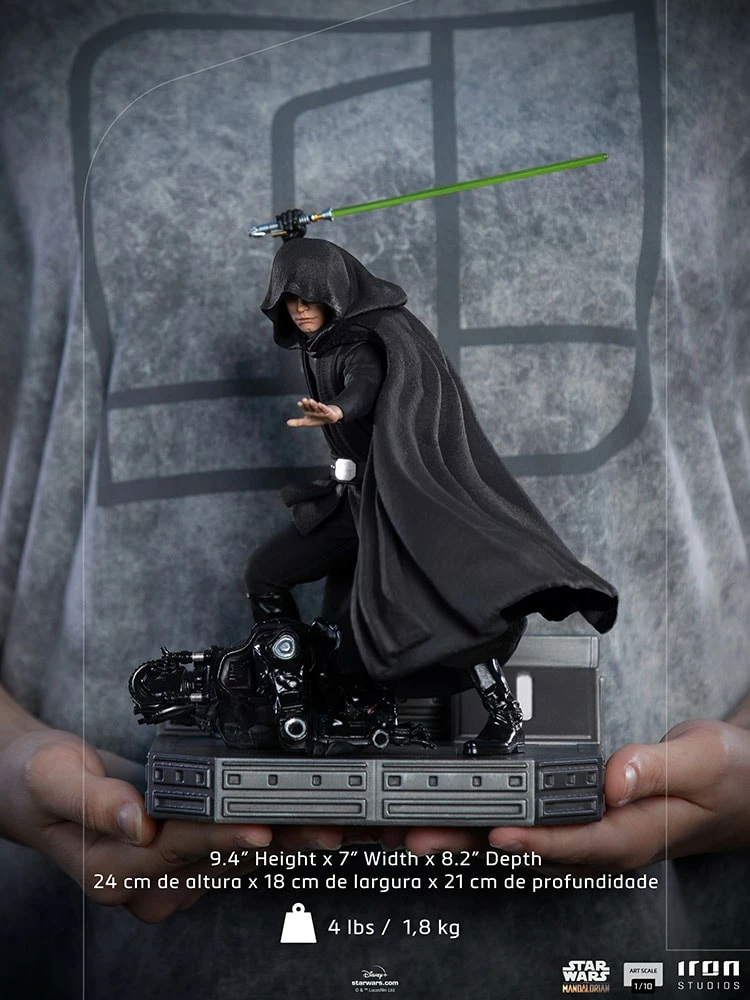 Aboard Imperial Officer Moff Gideon’s light cruiser spacecraft, the enigmatic figure of a Jedi Master, wearing a black hooded cloak, uses all his skill and connection to the power of Force with his left hand. In his right hand, with a glove, he masterfully wields a green lightsaber. At his feet lies the metallic remains of a deadly Dark Trooper droid, part of a security squad that tries in vain to stop the relentless warrior. Inspired by one of the most memorable scenes from the last episode of season 2 of the series The Mandalorian, Iron Studios presents the statue “Luke Skywalker BDS Combat Version – Art Scale 1:10 – The Mandalorian“, featuring the greatest hero of the Star Wars saga in his unexpected appearance on the Disney+ streaming series.