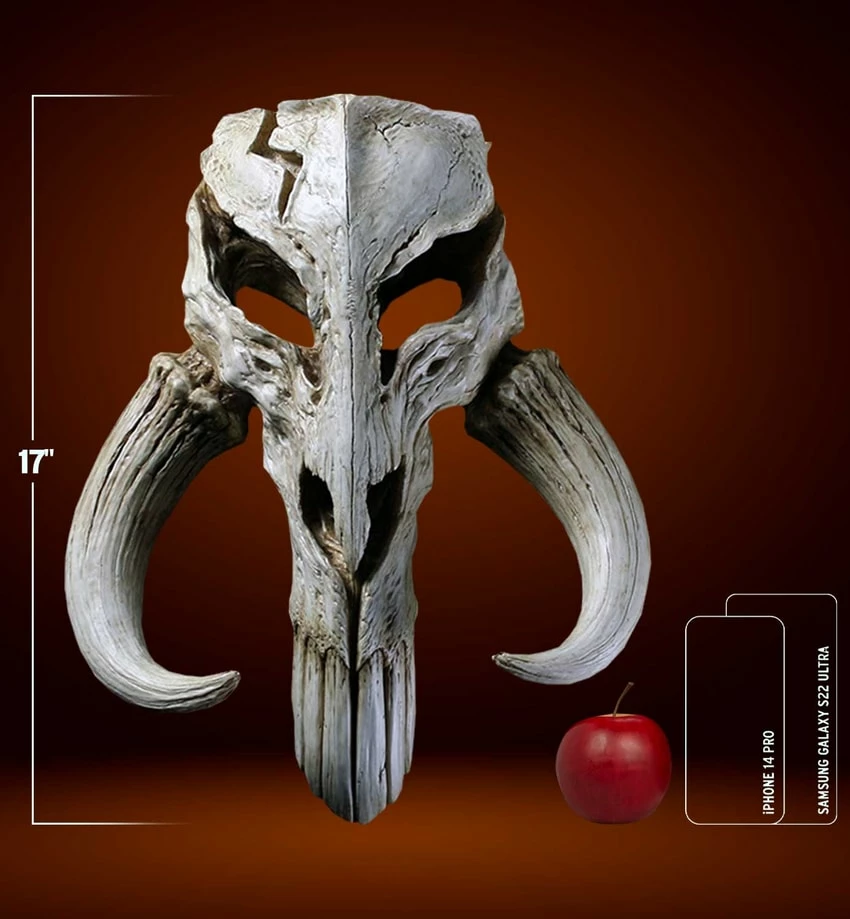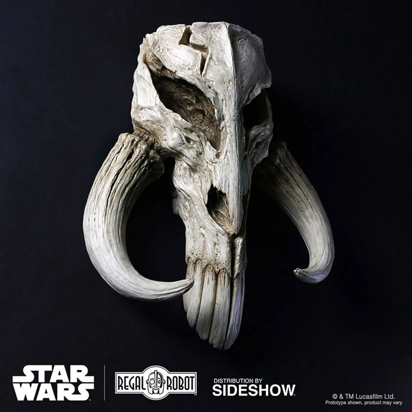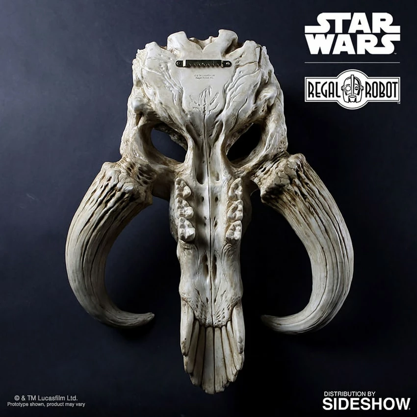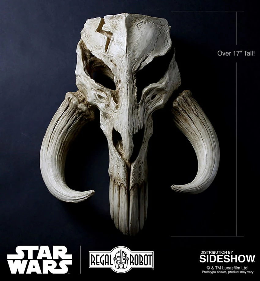 Sideshow and Regal Robot are proud to present the Mandalorian Skull Wall Decor. At over 17″ tall, this imposing and impressive sculpture was inspired the mysterious skull marking seen on the armor of iconic bounty hunter, Boba Fett. Alternatively referred to as a Bantha skull symbol or a Mythosaur skull symbol over the years, we’ve created a realistic interpretation of what that skull may have looked like, and the result pops with boldness and character.