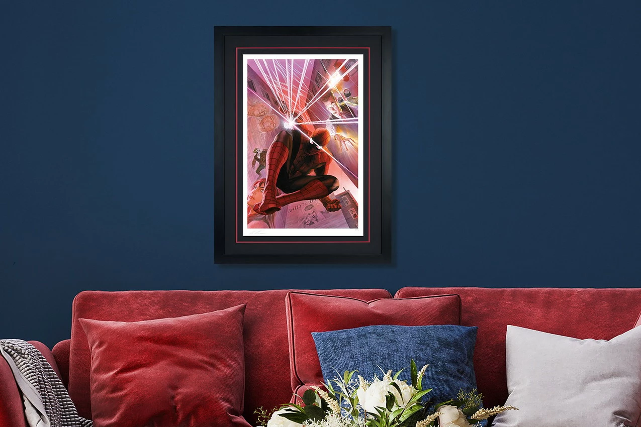Originally created as the cover to Amazing Spider-Man #1 (2014), this comic book collectible is now available to fans in a fine art format. Each Marvel 75th Anniversary: Amazing Spider-Man #1 Fine Art Lithograph is hand-signed by Alex Ross and includes a Certificate of Authenticity as a part of the limited edition of 250 pieces. Available as an unframed, certified archival fine art lithograph print or in a custom framed presentation, this Marvel wall art makes an amazing addition to any collection.