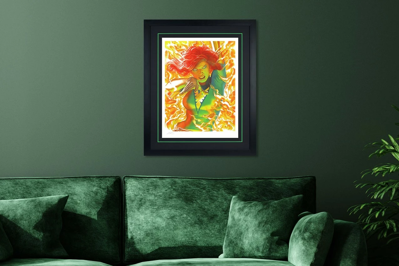 In an endless cosmic cycle of life and death, the Phoenix burns. This white-hot illustration by the legendary Alex Ross highlights the intensity of Jean Grey’s iconic transformation as the host of the unstoppable firebird. Dressed in her green and gold costume as flames swirl around her, this mighty Marvel mutant holds the rage of the Phoenix Force in her heart and in her eyes, battling to find the balance between its nurturing warmth and destructive heat.