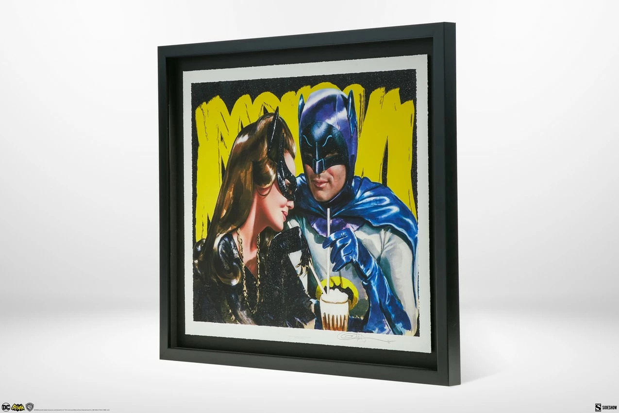 Meanwhile, at the Sweet Shoppe… captures the magnetic on-screen chemistry of Adam West and Julie Newmar in a scene from the classic 60s Batman television series. In a fan-favorite episode titled Catwoman Goes to College, the dubious feline femme fatale tries to use her feminine wiles on the hero of Gotham City, sweetly sipping on a shared malted milkshake. But of course, tender tongue-in-cheek moments like this can never last- Catwoman can’t wait to get her claws on him, secretly plotting another devious scheme!