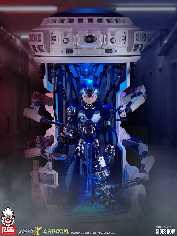 The capsule’s blue base lights up to further immerse Mega Man X in the environment, reflecting off his unarmored silver limbs as well as the iconic rounded armor that gives the hero his distinctive silhouette. Mega Man X comes with two expressions — one active, determined face and a portrait with closed eyes to reflect his capsule stasis. Metallic blue paint and red accents complete Mega Man X’s intricate robotic look to make this a striking display on any shelf.