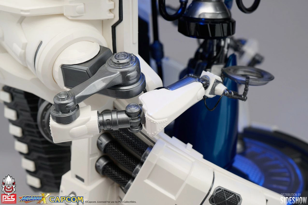 The capsule’s blue base lights up to further immerse Mega Man X in the environment, reflecting off his unarmored silver limbs as well as the iconic rounded armor that gives the hero his distinctive silhouette. Mega Man X comes with two expressions — one active, determined face and a portrait with closed eyes to reflect his capsule stasis. Metallic blue paint and red accents complete Mega Man X’s intricate robotic look to make this a striking display on any shelf.