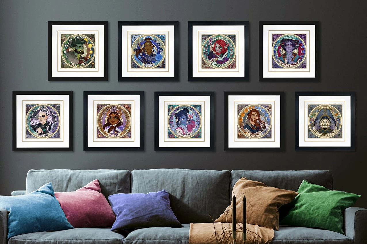 Each individual print in the Mighty Nein Portrait Series (Set of 9) features an embossed Seal of Authenticity as a part of the official Critical Role collection from Sideshow. The complete set is available unframed or in a custom framed format, allowing fans to arrange this gallery of heroes to their hearts’ content and create the ultimate tribute to this beloved adventuring team.