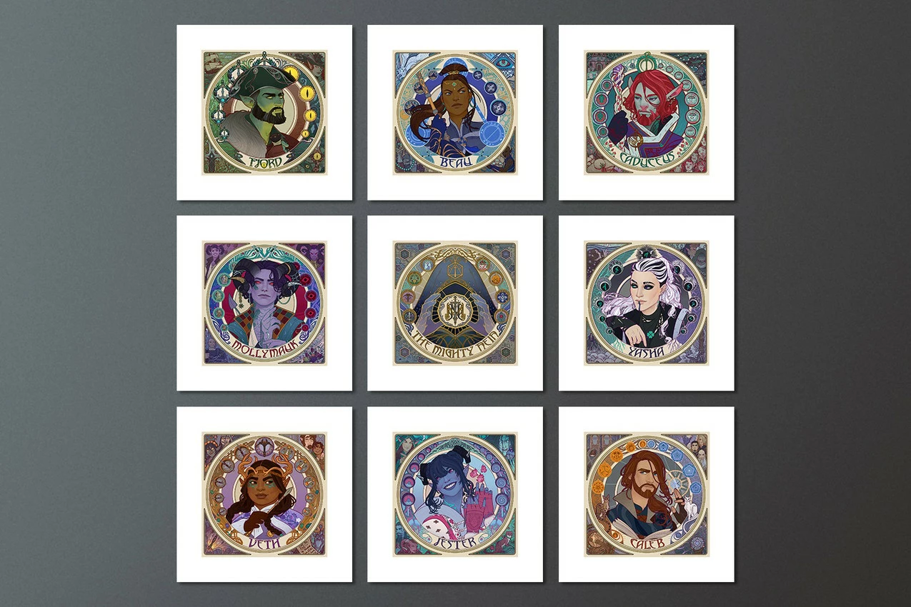 Inspired by Art Nouveau portraiture, Sam Hogg captures the beauty, brilliance, and badassery of the heroes of Critical Role: Campaign 2 in this collectible series. The Mighty Nein Portrait Series (Set of 9) unites eight beloved adventurers and the guiding force of the Hands of Fate in one dazzling collection for Critters who don’t want to split the party! This art print series includes Mighty Nein members Fjord, Beau, Caduceus, Veth, Jester, Caleb, Yasha, and Molly, each in their own spotlight illustration surrounded by symbols and familiar faces representing their journey through Wildemount. Each portrait is packed with detail that will leave you exploring every nook and cranny of Exandria to relive this team’s most memorable moments.