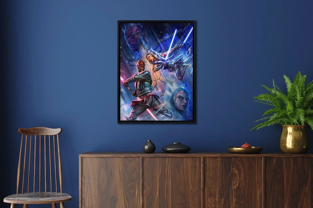 Each One Last Lesson: Ahsoka Tano vs Darth Maul Canvas Art Print features an authorized, automated artist signature and includes a Certificate of Authenticity as a part of the limited edition of only 75 pieces. The luxury canvas print is also professionally finished with certified archival protective varnish and comes mounted in a black wood floating frame with wire hanger installed for ease of display. This exhilarating Star Wars wall art is a must-have moment in galactic history for fans.