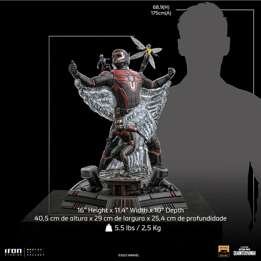 With subatomic particles enlarging and reducing his mass and density, the former convicted thief and reluctant hero once again wears the special costume that allows him to manipulate his size and strength and returns to the mysterious Quantum Realm, an extradimensional universe accessible through magic, through the unique Pym Particles, or through the inter-dimensional gateway called Quantum Tunnel. In his giant form, the avenger hero brings Cassie Lang on his right shoulder, his now-grown-up daughter with her own costume as the heroine Stature, and his beloved partner Hope van Dyne, the Wasp, clapping her wings and flying over his left shoulder. Over a detailed base with technological and futuristic elements that refer to Axia, a city established in the Quantum Realm, Iron Studios proudly present their Quantumania Ant-Man and the Wasp Deluxe – Quantumania – Art Scale 1:10 Statue based on the 31st movie in the MCU, where Scott Lang and his family face the threat of Kang, the Conqueror.