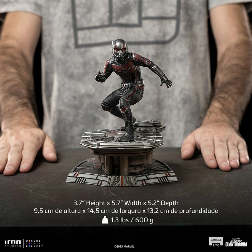 With subatomic particles enlarging and reducing his mass and density, the former convicted thief and reluctant hero once again wears the special costume that allows him to manipulate his size and strength and returns to the mysterious Quantum Realm, an extradimensional universe accessible through magic, through the unique Pym Particles, or through the inter-dimensional gateway called Quantum Tunnel. Iron Studios bring the Quantumania Ant-Man – Quantumania – Art Scale 1:10 Statue, with the miniature Avenger ready for action over a platform base inspired by the architecture of the futuristic city Axia from the Quantum Realm, based on the 31st movie in the MCU, where Scott Lang and his family face the threat of Kang, the Conqueror.