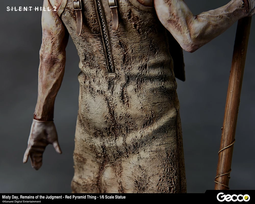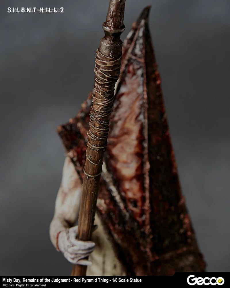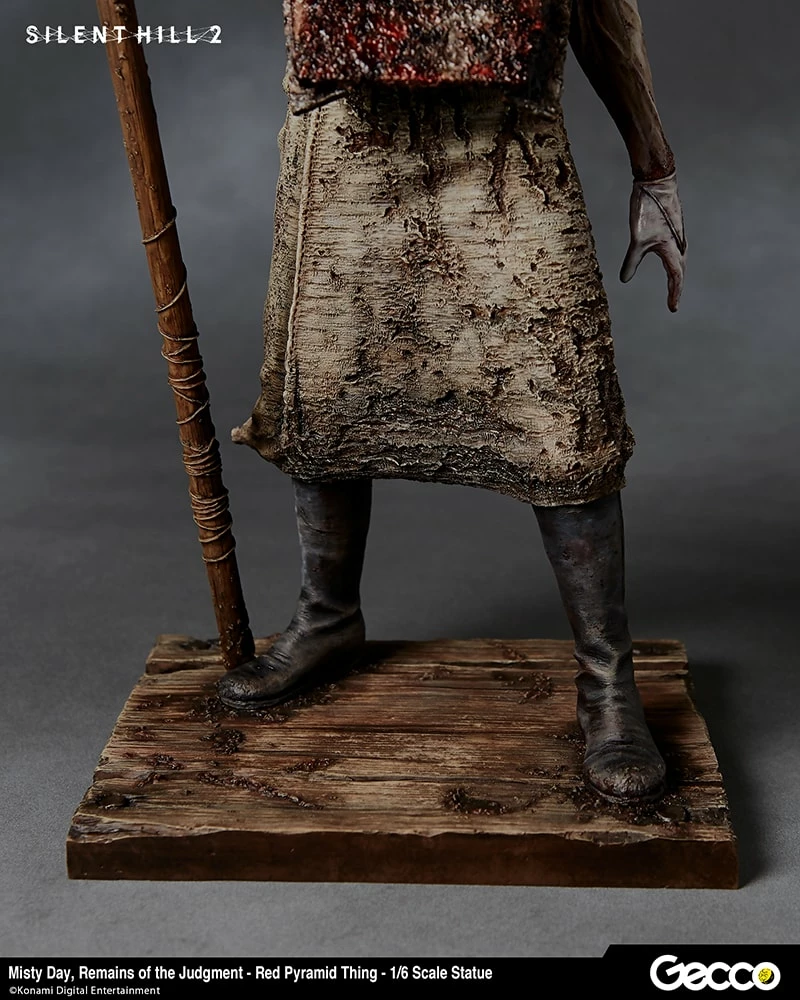 The imposing upright posture, with the long spear in hand, recreates the iconic image of the executioner as seen in the painting “Misty Day, Remains of the Judgment” at the historical museum in Silent Hill. The iconic helmet, which the name Red Pyramid shows, recreates not only a rusty metallic expression but also a creature-like element. The details captured on the entire body of this horror collectible, such as painful raw wounds, rough skin, and eroded and torn clothing, are other highlights that must be seen.