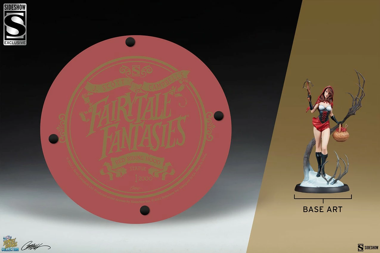 The Exclusive Edition of the Red Riding Hood Statue includes a metal art plate and matching stand featuring one of J. Scott Campbell’s concept designs for the character, perfect for displaying alongside the statue or independently in your art collection.