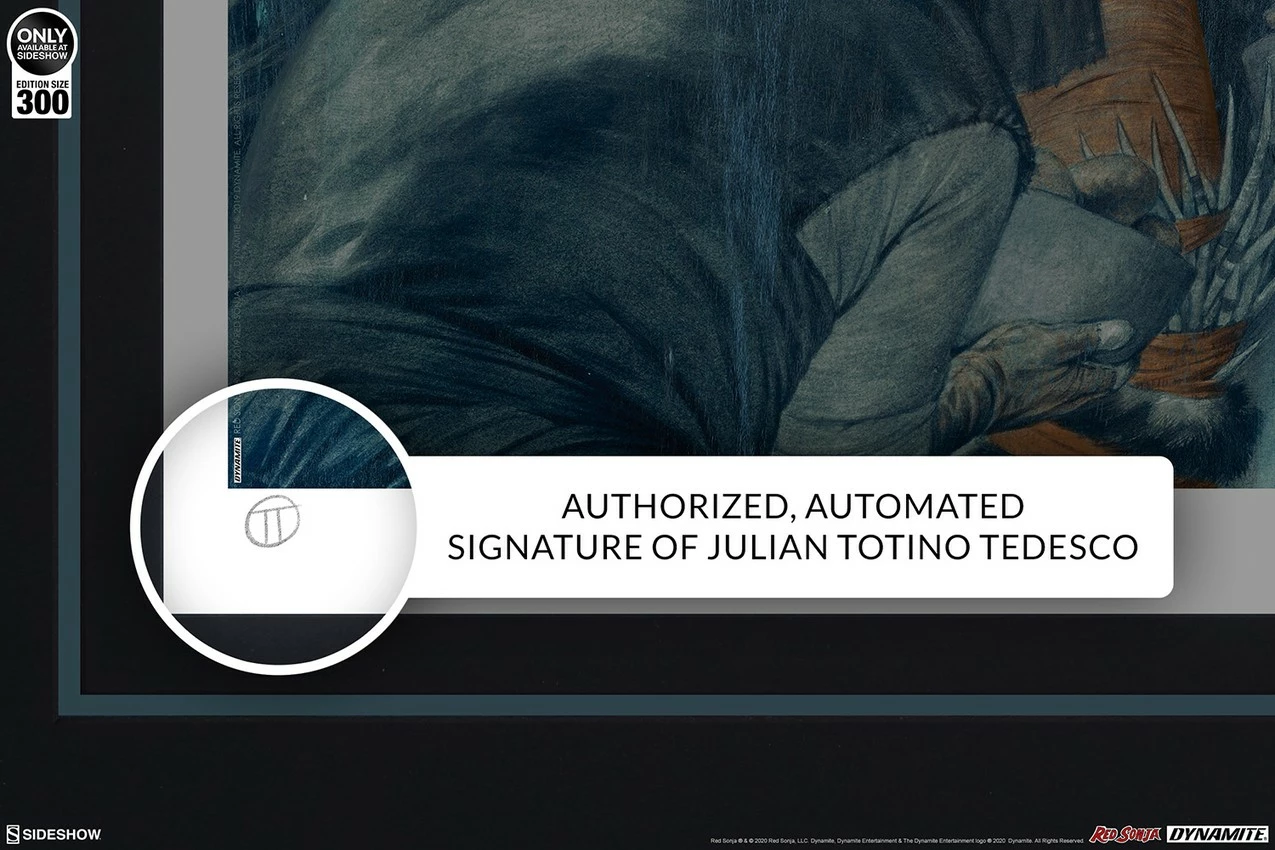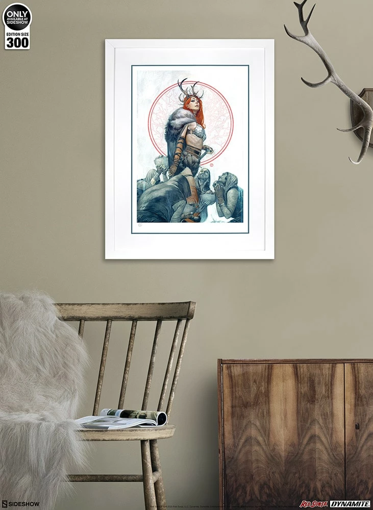 Originally created as a variant cover for Red Sonja #3 (2019), written by Mark Russell for Dynamite Entertainment, this beautiful comic book illustration is now available to fans as a fine art collectible. Each Red Sonja: Queen of Hyrkania Fine Art Print features an authorized, automated artist signature and an embossed Seal of Authenticity as a part of the limited edition of 300 pieces.