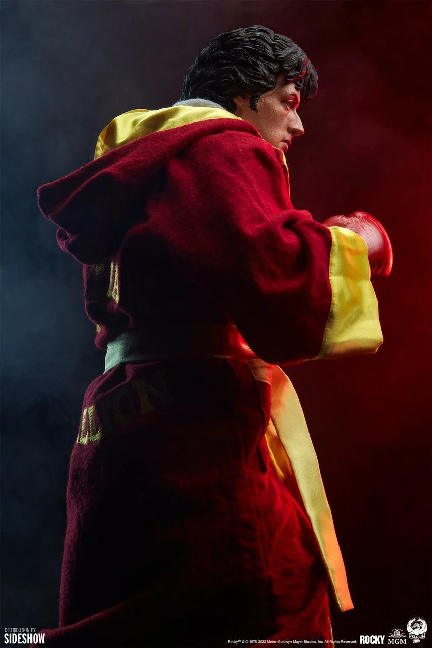The Rocky 1:3 Scale Statue features a mixed media costume with custom tailored fabric elements giving collectors multiple configuration options. His red and white fabric shorts include the Stallion branding on the waistband, and the piece includes a red and yellow hooded Italian Stallion robe and a white fabric towel that can also be displayed on the figure. The Rocky Statue also features sculpted white boots, striped socks, and red gloves to complete his ring look. Taking a prepared stance, this statue embodies all of the action and intensity of an unforgettable cinematic icon.