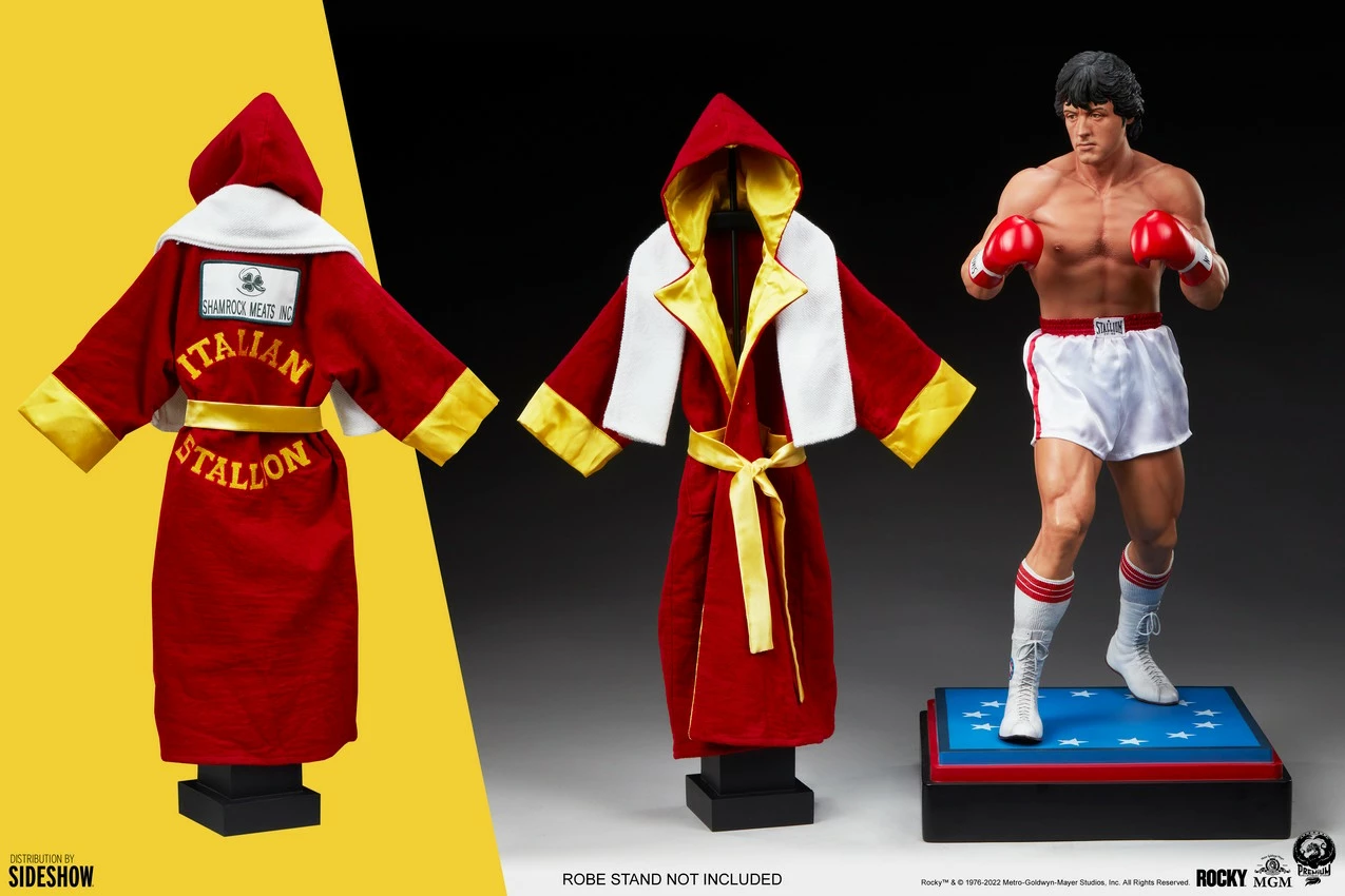 The Rocky 1:3 Scale Statue features red and white fabric shorts with Stallion branding on the waistband and also includes a red and yellow hooded Italian Stallion robe and a white fabric towel that can be displayed on the figure. The Rocky Statue additionally has sculpted white boots, striped socks, and red gloves to complete his ring look.