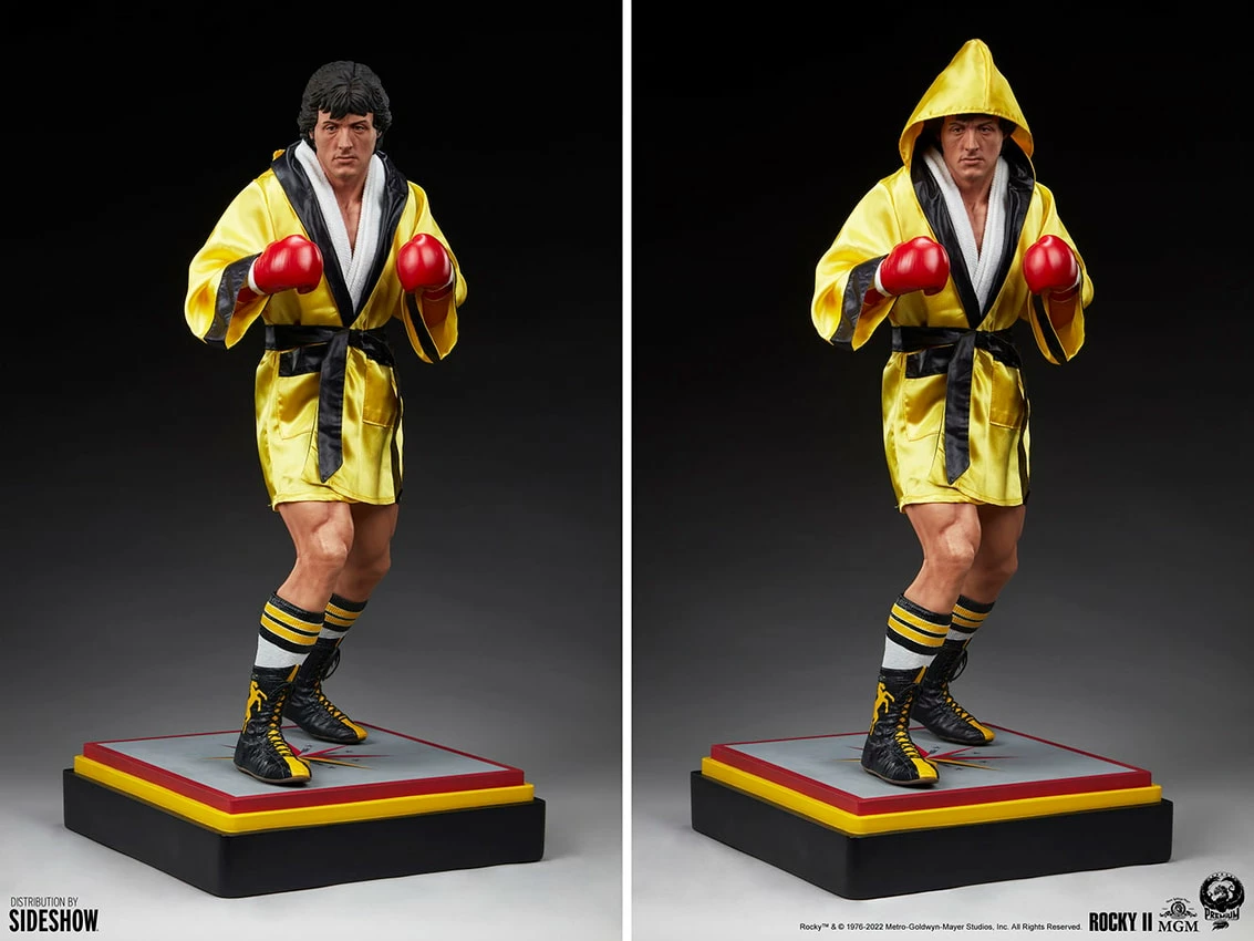 The Rocky II 1:3 Scale Statue features black and gold fabric shorts with the word Rocky on the thigh and also includes a gold and black hooded Italian Stallion robe and a white fabric towel that can be displayed on the figure. The Rocky Statue additionally has sculpted black boots with a gold stallion design, striped socks, and red gloves to complete his ring look from the hit sequel.