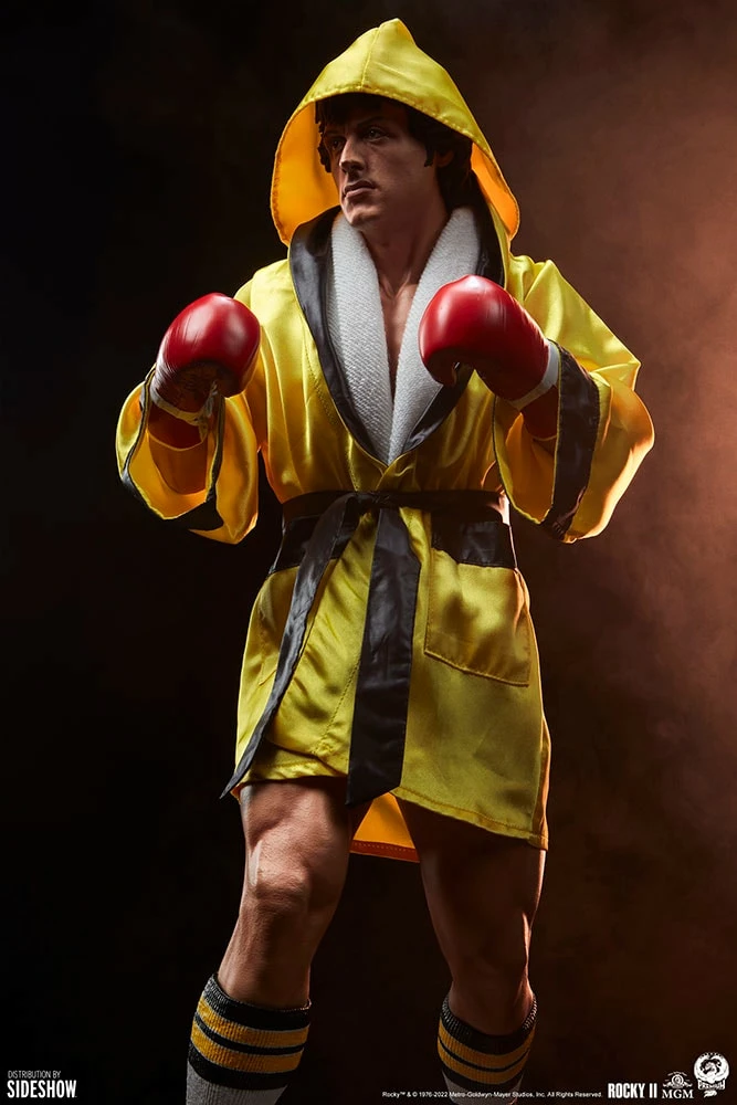 The Rocky II 1:3 Scale Statue features a mixed media costume with custom tailored fabric elements giving collectors multiple configuration options. His black and gold fabric shorts feature the word Rocky on the thigh, and the piece includes a gold and black hooded Italian Stallion robe and a white fabric towel that can also be displayed on the figure. The Rocky II Statue also features sculpted black boots with a gold stallion design, striped socks, and red gloves to complete his ring look. Taking a prepared stance, this statue embodies all of the strength and tenacity of an unforgettable cinematic icon.