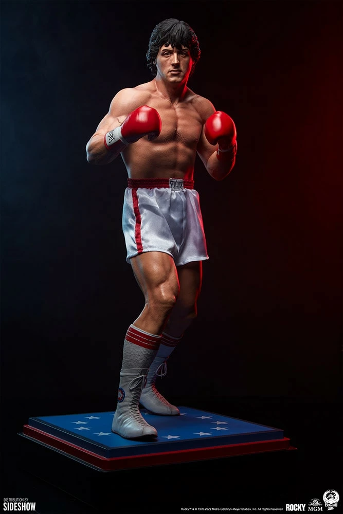 Step into the ring with Rocky Balboa, whose iconic on-screen presence has been captured in an extremely detailed and lifelike 1:3 scale collectible format. Measuring 25.7” tall, the Rocky Statue depicts the chiseled heavyweight boxer as he appeared in his first film outing, in the climactic fight against Apollo Creed. He stands on a black, red, and blue square base detailed with white stars to capture the appearance of the boxing ring canvas.